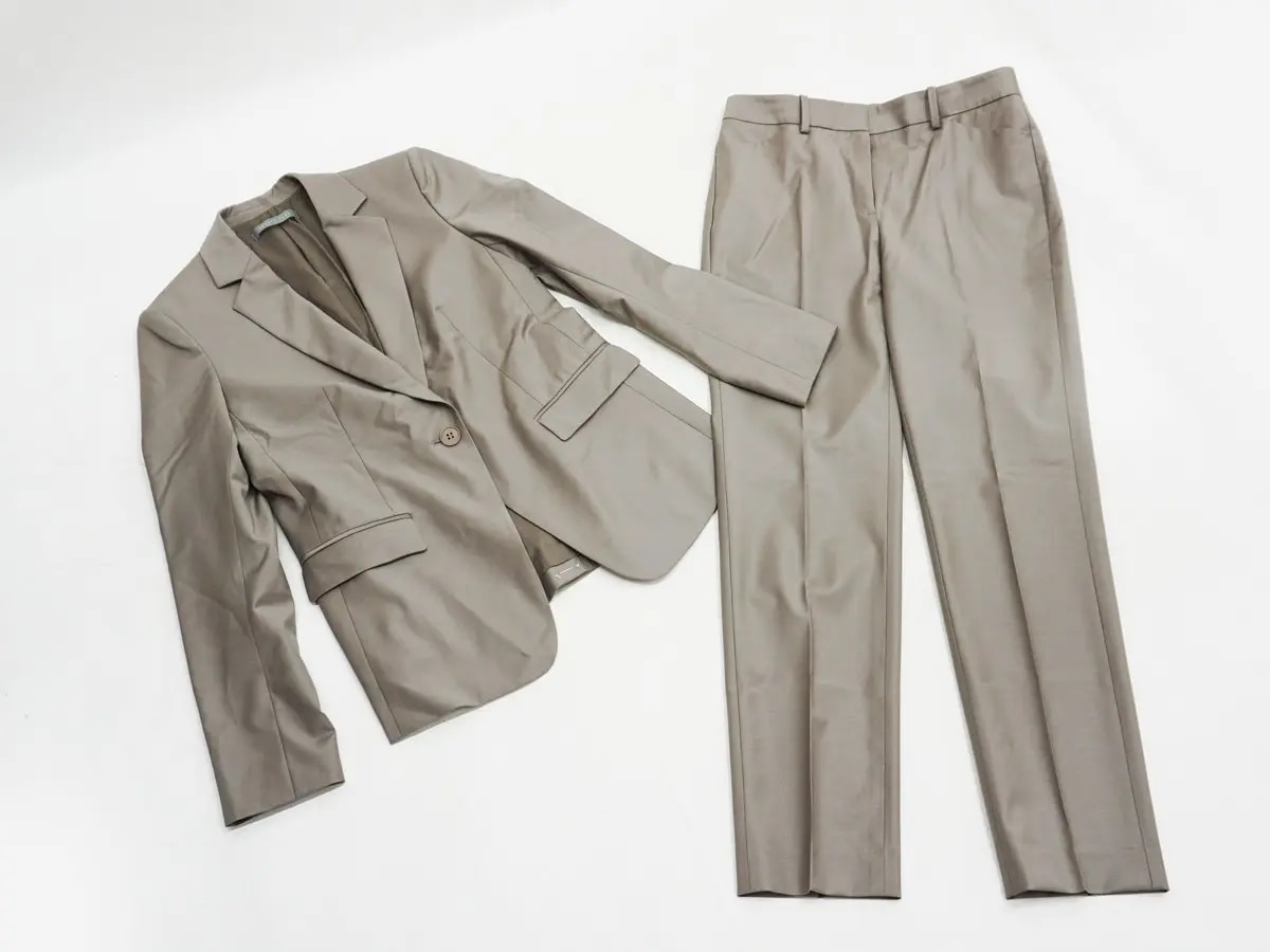 こちらはソフトグレーの柔らかく上品な印象が魅力のセットアップで、サイズは38でございます。