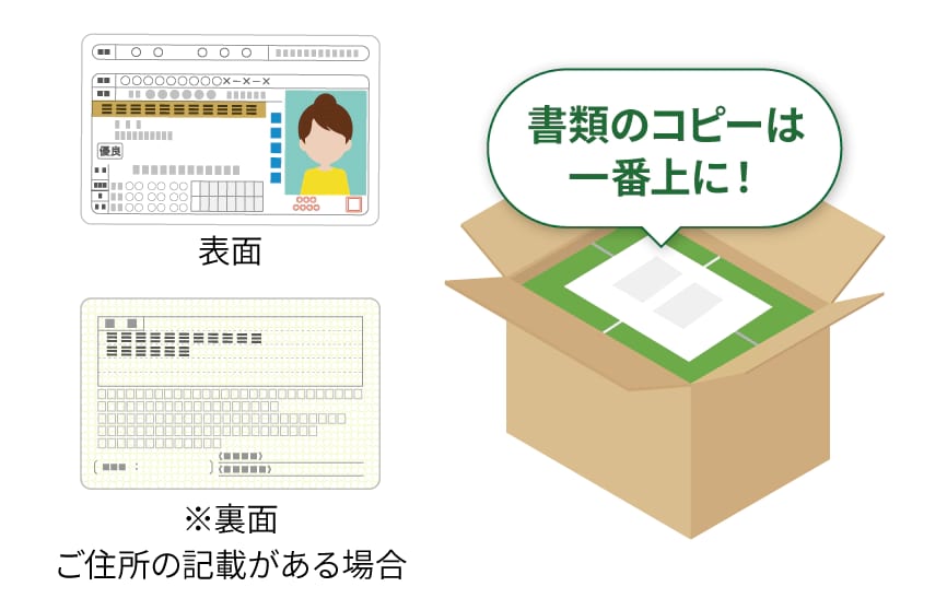 ご自宅集荷の場合本人確認書類をスマートフォンかデジタルカメラで撮影し、買取申込完了後から商品集荷までに画像データをマイページより送信(アップロード)コンビニ持ち込みの場合本人確認書類(運転免許証のみ対応)と買取申込をされたご本人の顔をマイページ、またはゲスト専用画面にてスマートフォンで撮影 -