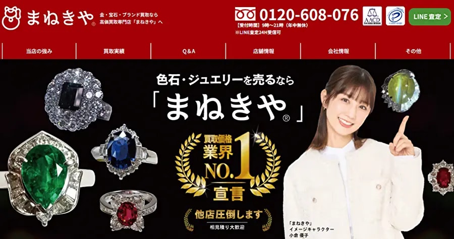 | まねきや | 店舗買取、出張買取、宅配買取 | 金、プラチナ、宝石、ブランド品、時計、着物、古銭、切手、カメラなど | 査定料・送料・出張料・振込手数料・キャンセル料すべて無料 | 宅配キット無料 |