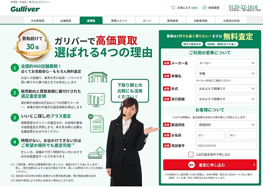 ガリバーオンライン、出張、持ち込み電話最短2営業日9:30〜20:00