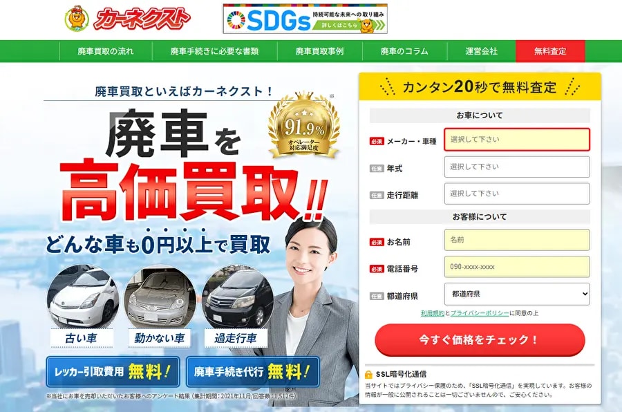 「カーネクスト」は、廃車買取に特化したサービスで、事故車や不動車、水没車など、他社で断られた車でも原則0円以上での買取を実現しています。
