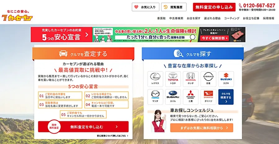 「カーセブン」は、車の買取から販売までを一貫して行うことで中間コストを削減し、高価買取に挑戦するサービスです。とくに、「5つの安心宣言」が好評で、契約金半額の当日支払い、契約後の減額なし、7日以内のキャンセル無料など、売却時の不安をしっかり解消してくれます。