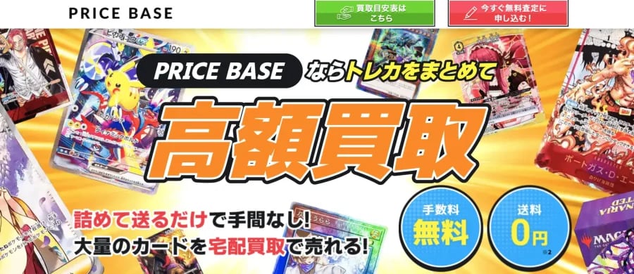 | PRICE BASE | 宅配買取 | 遊戯王、ポケモンカード、ヴァイスシュヴァルツ、MTG、ワンピースカード、ドラゴンボールヒーローズほか | あり(各トレカの買取表を公開) | 出張買取未対応 | 送料・査定料・振込手数料無料。キャンセル返送料は利用者負担 | https://price-base.com/useful/toreca-kaitori |