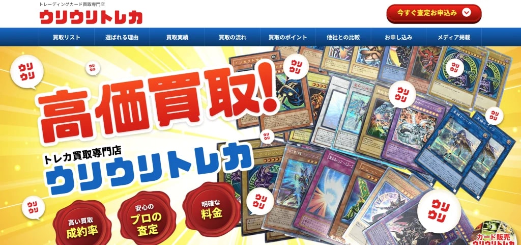 | ウリウリトレカ | 宅配買取 | 遊戯王、ポケモンカード、MTG、デュエルマスターズ、ワンピースほか | – | 出張買取未対応 | 査定料・送料・宅配キットすべて無料。キャンセル返送料は利用者負担 | https://uriuritoreca.com/ |