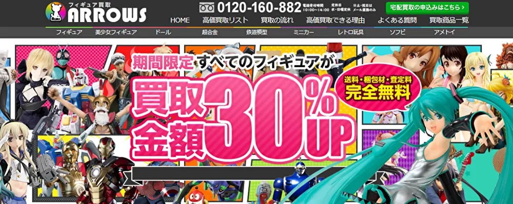 | 7位 | フィギュア買取アローズ | 宅配 | フィギュア、ドール、鉄道模型、アメトイほか | 宅配:全国 (沖縄・離島除く) | 午前10時~午後2時 |