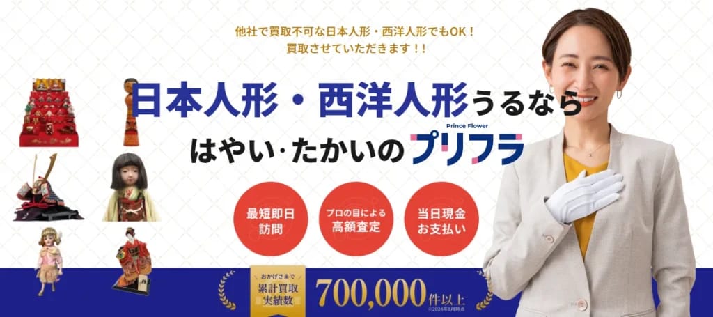 | プリフラ | 出張 | 五月人形、雛人形、こけし、フランス人形、市松人形ほか | 福島県、東京都、神奈川県、千葉県、 埼玉県、群馬県、栃木県、茨城県、 新潟県、愛知県、静岡県、山梨県、 長野県、岐阜県、大阪府、 京都府、 兵庫県、 奈良県、 滋賀県、 三重県、 和歌山県、岡山県、福岡県 | 即日 | 午前8時~午後6時 |