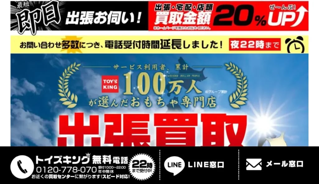 | ホビーコレクト | 出張買取/宅配 | WEB/LINE | 関東/北陸 | 約1週間 | 2日以内 | LINE査定OK&壊れたおもちゃも買取対象。初めてでも使いやすい | |||||