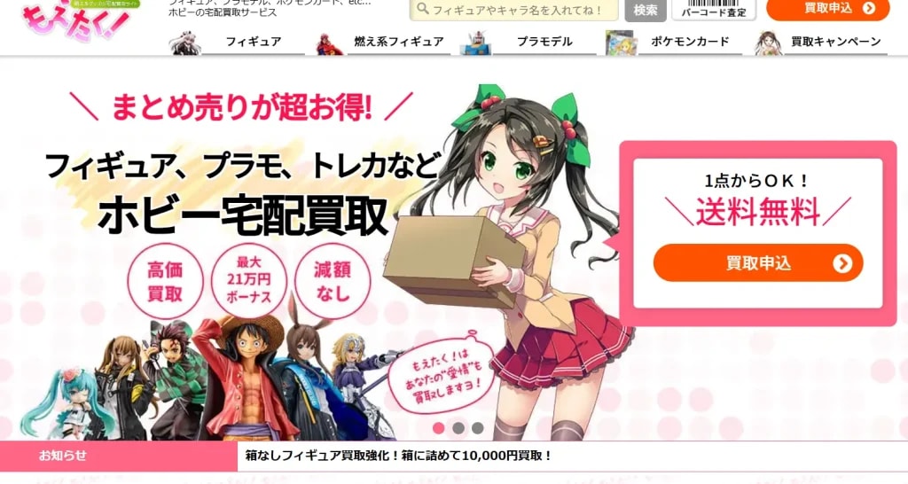 | もえたく! | 宅配 | WEB | 3日前後 | 2日以内 | 萌え系・箱なしフィギュア歓迎!初回特典&クーポンでお得にスタート | ||||||