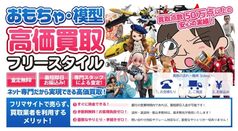 査定は約1週間、入金までは2日以内と対応もスピーディ。壊れたおもちゃの査定にも対応しており、処分を迷っていた品も相談しやすいのが特徴です。