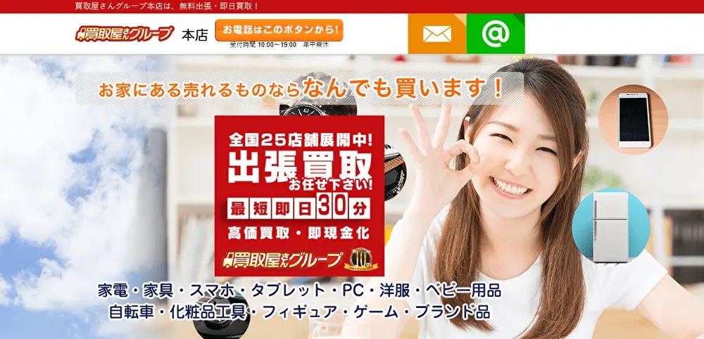 | 買取屋さんグループ | 出張買取 | 無料 | 離島を除く日本全国 (買取屋さんグループ全国各支店近隣) | ブランド品/家具家電/ゲームなど | キャンセル料無料 |
