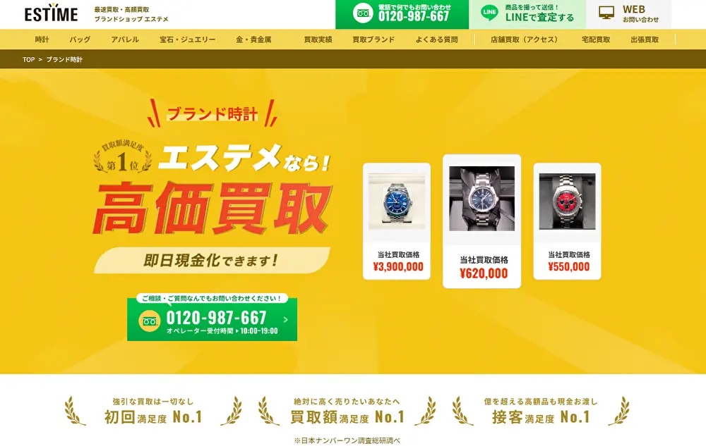 | エステメ | 店頭・出張・宅配(LINEで事前査定可) | ロレックス、オメガ、カルティエ、パテック フィリップ、オーデマ ピゲ、ヴァシュロン・コンスタンタン、リシャール・ミル 他多数 | 高級ブランド時計全般(バッグ・アパレル・宝石・金/貴金属も対応可) | 傷あり、箱・保証書なしなど状態問わず相談可(不動品も相談可) | 無料(キャンセルも無料) |